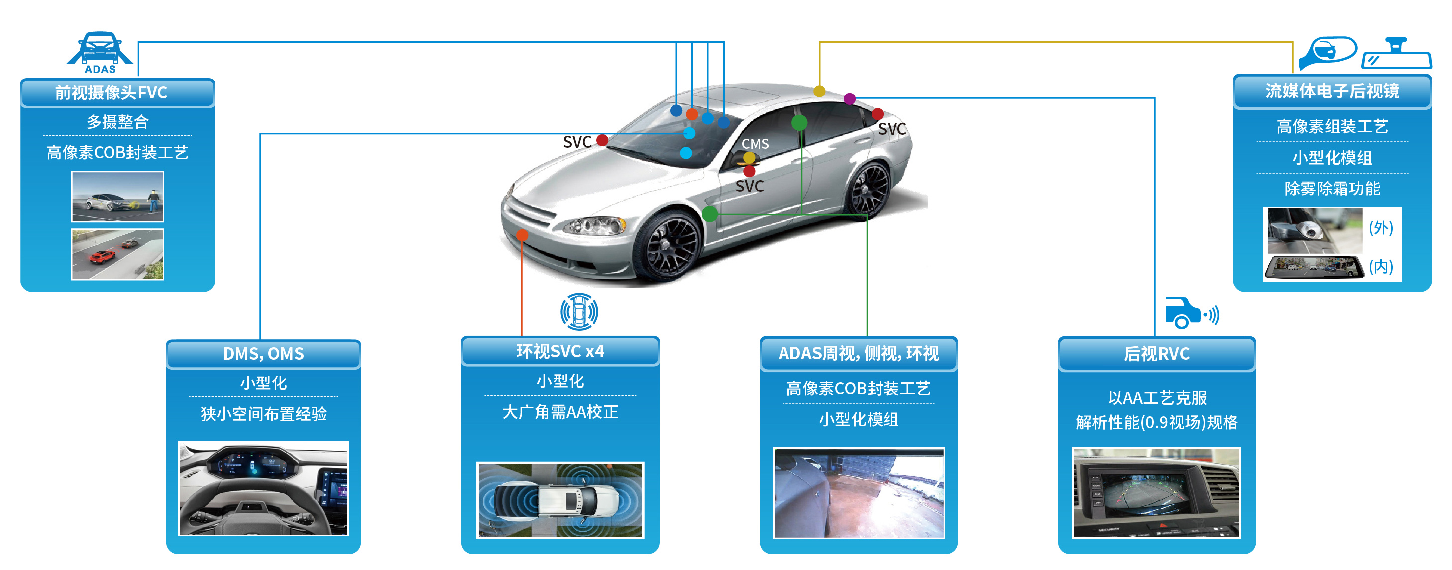 傳感器方面:公司為客戶提供全套攝像頭解決方案,包含:前視,側(cè)視,環(huán)視,電子外后視(CMS),駕駛員監(jiān)控(DMS),乘客監(jiān)控(OMS)等。產(chǎn)品覆蓋1M-8M,48M車頂云臺及12M、17M高像素產(chǎn)品即將量產(chǎn)。